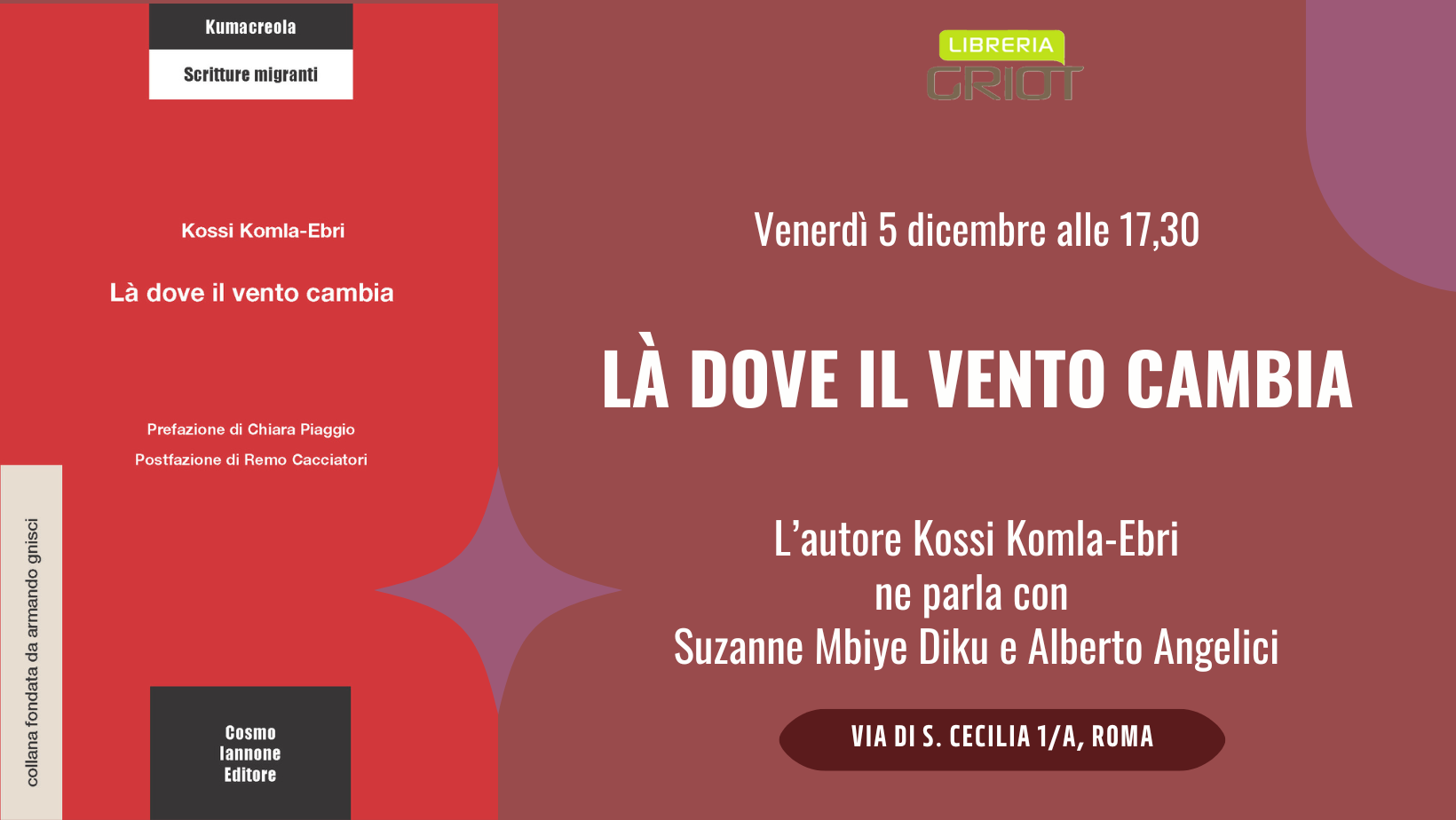 Venerdì 5 dicembre alle 17,30 GRIOT ospita la presentazione di "Là dove il vento cambia" di Kossi Komla Ebri Dialogano con l'autore Suzanne Mbiye Diku e Alberto Angelici Un ospedale nel cuore del Togo. Un crocevia di vite, speranze e contraddizioni. La Providence è un microcosmo pulsante dove religiosi, medici, infermieri e volontari di ogni […]