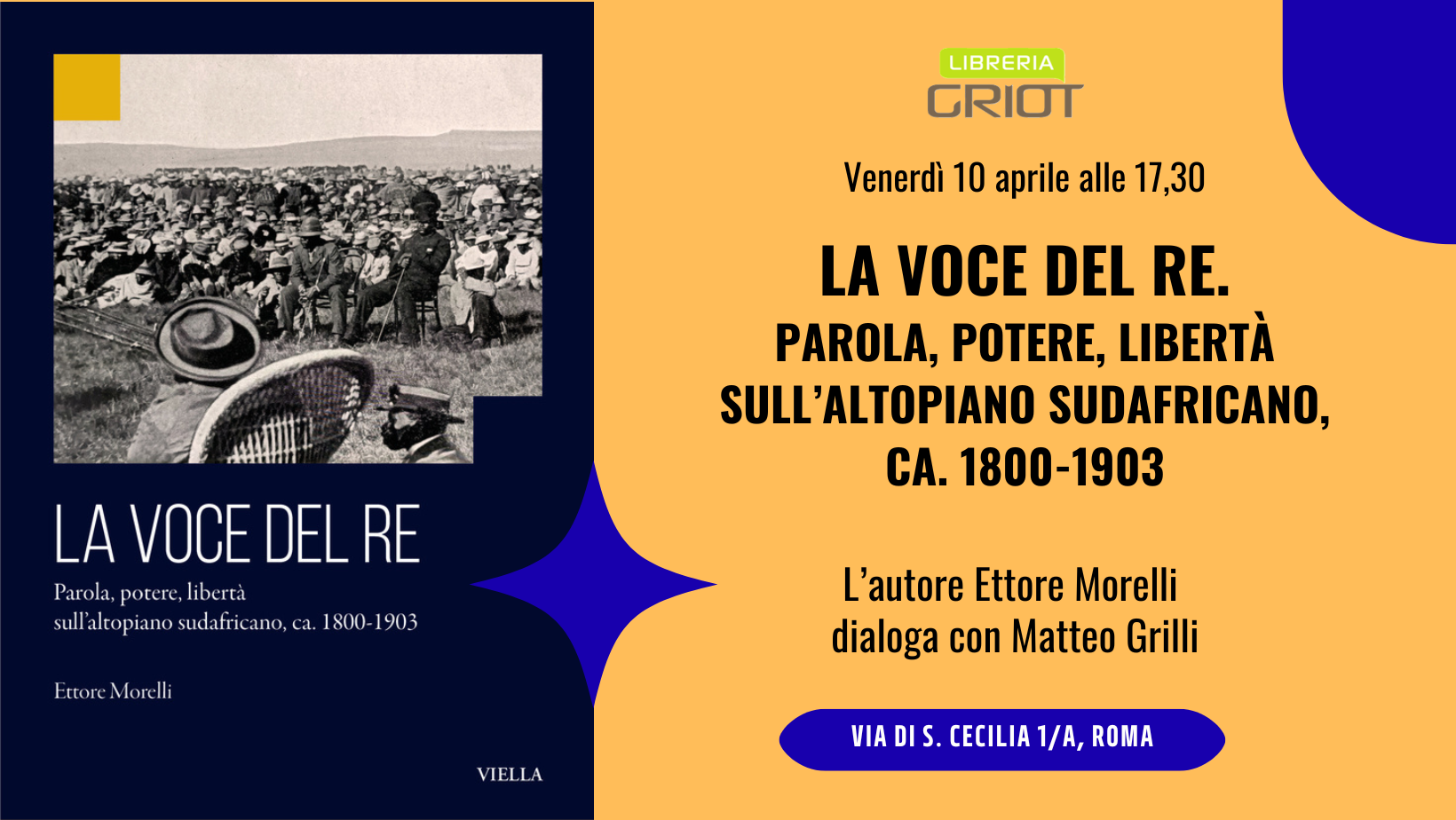 Venerdì 10 aprile alle 17,30 GRIOT ospita la presentazione de "La voce del re" di Ettore Morelli (Viella) Dialoga con l'autore Matteo Grilli (Università di Pisa) Il volume ricostruisce per la prima volta il ruolo della voce in due importanti istituzioni politiche dell’altopiano sudafricano del diciannovesimo secolo: l’assemblea e il consiglio. Lo studio approfondisce in […]