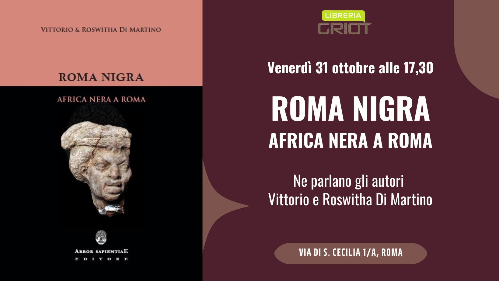 Venerdì 31 ottobre, alle 17.30, GRIOT ospita la presentazione di “Roma nigra. Africa nera a Roma” di Vittorio e Roswitha Di Martino, pubblicato da Arbor Sapientiae Edizioni. Partecipano gli autori.